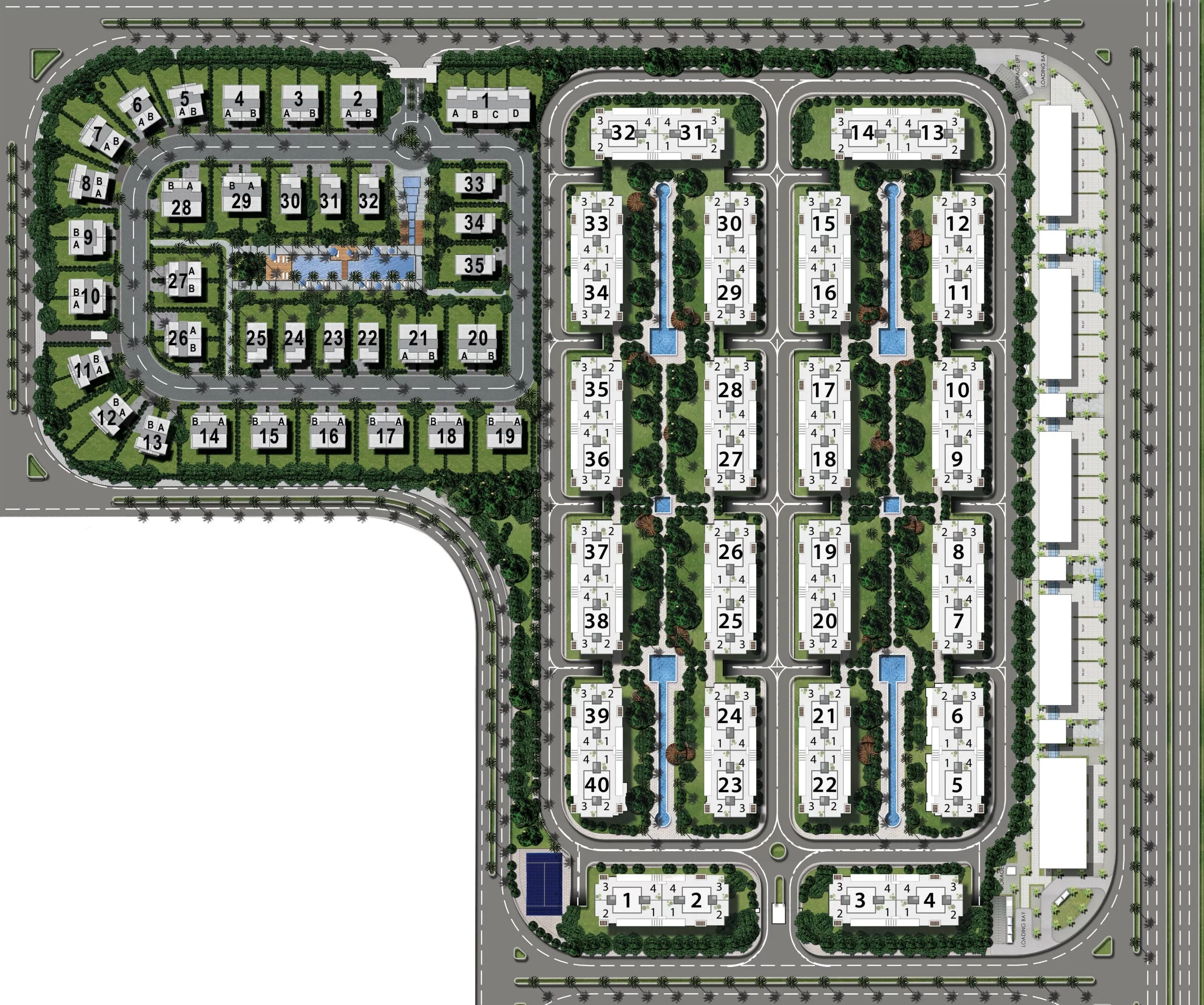 الكمبوند بيحتوي على 40 عمارة سكنية بارتفاع أرضي + 3 أدوار. أما عن الفيلات فبيحتوي على 62 فيلا مختلفة واتنوعت الوحدات بين: